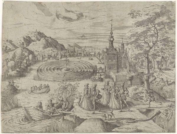 Curator: This etching by Frans Hogenberg, created in 1593, offers a panoramic view of "Sevilla met vele figuren op de voorgrond"—Seville with many figures in the foreground. It’s a wonderfully detailed piece. Editor: It’s quite striking, the contrast between the ordered city in the background and the bustling, almost chaotic scene playing out in the foreground. It gives a real sense of a society’s diverse activities and social classes. Curator: Absolutely. Hogenberg’s skilled use of engraving techniques on paper is remarkable here. Notice the detailed rendering of the city’s architecture, achieved with layered lines and cross-hatching to give depth and texture. He also skillfully incorporates figures and landscape, typical of Northern Renaissance printmaking. Editor: Looking closer, it is difficult to determine whether Hogenberg means for us to take this scene at face value, as simply representative of quotidian occurrences within Seville, or whether there may be some specific political narrative attached. Notice how the various groupings, some in transit, some stationary, indicate very clear status within this hierarchy of the time. What stories do you think they are attempting to portray? Curator: Hogenberg’s cityscapes often functioned within a specific historical context, documenting and celebrating important events and cultural aspects. It served both informational and artistic purposes, revealing the meticulousness involved in its production, considering that all this detail would have been carved by hand. Editor: And speaking to the material of the artwork itself, the creation of multiple prints democratized the image. It's fascinating to consider the print’s journey and impact: Who commissioned it? Who could afford it? Where did copies of the work eventually circulate? It forces a social interrogation alongside art appreciation. Curator: Precisely. These details give insight into the economic systems supporting such craftsmanship, from sourcing quality paper to marketing and selling the finished prints, which ultimately would be dispersed amongst people throughout various countries. It is the system of its making, more so than the art itself that gives the artwork its intrigue. Editor: I agree completely. For me, Hogenberg's print encapsulates a moment of cultural negotiation, reminding us of art's power to document, disseminate, and shape perspectives of an era through its distribution and availability, therefore revealing implicit values through subject matter, which become the legacy. Curator: I see it primarily as a window into the artisanal skill and labor practices of the 16th century—a reminder of how much work went into creating these seemingly simple paper objects that ended up as artifacts themselves, their social context now inevitably woven into its materiality.