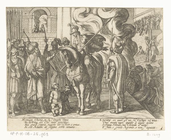 Antonio Tempesta created this print, "Gonzalo Gusto gives a ring that must be given to his unborn child if it is a son", sometime between 1555 and 1630. The image depicts a scene of negotiation and anticipation tied to dynastic succession. Made in the context of early modern Europe, the image engages with ideas about lineage, power, and the role of inheritance in shaping social structures. The visual codes of the print, such as the exchange of a ring, carry significant cultural weight, signifying promises and future obligations. This print offers insight into the social values placed on male heirs and the strategies employed to secure their futures within elite circles. It invites us to consider the politics of imagery and the social conditions that shape artistic production. To understand this print more deeply, one could research the history of family structures, gender roles, and inheritance laws in early modern Europe. By exploring such resources, we can gain a richer appreciation for the social and institutional context in which this artwork was created.