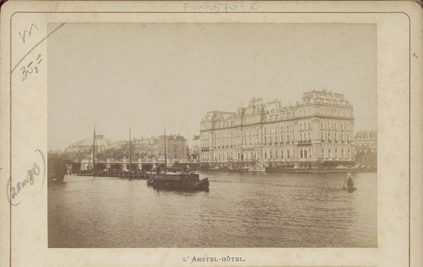 Andries Jager made this photograph of the Amstel Hotel with boatmen in the foreground sometime in the 19th century. The photograph’s composition arranges the imposing structure of the Amstel Hotel along the horizon, a testament to architectural ambition. Notice how the building’s facade is softened by the tonal range of the photograph, creating an interplay between the monumental and the intimate. The surface of the Amstel river mirrors the hotel, binding the architectural with its watery reflection, further activated by the figures in the foreground. Considering the semiotic structure, the hotel acts as a signifier of luxury and modernity, sharply contrasted by the boatmen who embody labour and tradition. This juxtaposition isn't just a visual element; it suggests a deeper dialogue about societal progress. The linear perspective leads the viewer's eye from the activity on the river towards the static grandeur of the hotel, asking us to consider the relationship between these contrasting worlds. Ultimately, it's the photograph's ability to capture this tension that lends it significance, inviting viewers to engage with its complex cultural narrative.