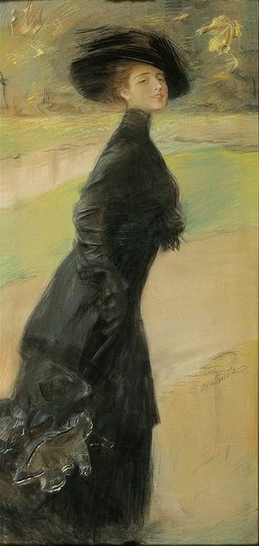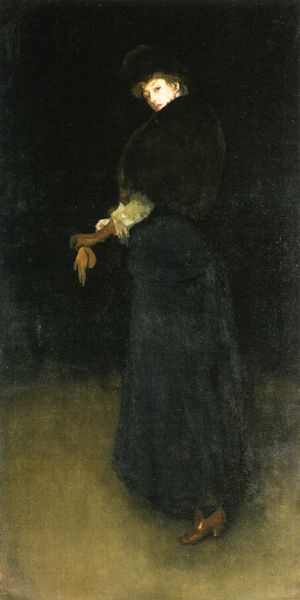 Curator: Here we have Gustav Klimt’s "Portrait of a Lady," created in 1897 using pastel. What captures your attention first? Editor: Well, the way the red backdrop seems to vibrate against the dark silhouette of her dress. There's something almost unsettling about it, a kind of glamorous unease. Curator: Absolutely, there is this tension between the almost ephemeral quality of the pastel and that potent darkness. It’s as though she’s both present and fading away, doesn't it strike you? And of course, Klimt was moving into a period infatuated with depicting the female psyche, so maybe that makes sense. Editor: It makes perfect sense. Speaking of materials, though, pastel seems like an odd choice when his future style of mixing heavy gold leaf with oil paint on canvas became his trademark look. So, this pastel feels a bit lighter somehow. It's interesting, also, given that at the time pastels were considered more the domain of hobbyists or, you know, genteel ladies. For Klimt to use pastel suggests perhaps a certain approachability of the medium that contradicts the very rigid view one usually sees when it comes to thinking about Viennese society. Curator: I'd agree, and Klimt knew it. This almost 'unfinished' quality is precisely where it gains its power, in my opinion. It shows us a certain fragile honesty. Do you suppose there is a level of intentional provocation, with that knowledge about materials in mind? Editor: Certainly. Choosing pastel isn't just about convenience; it is about making a statement about art's potential to move away from historical standards. The fleeting, almost powdery touch mirrors the era's shifting social structures. And, I’d say her distant gaze certainly adds to the air of melancholy in terms of her own interior world and potential. Curator: Absolutely! It gives you so much to ponder about the woman and her station. Editor: Agreed, this exploration shows me just how rebellious choices about media can transform our perception of an artwork! Curator: Indeed! It gives one lots to consider about the materials that build our perceptions of value!