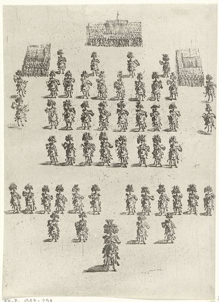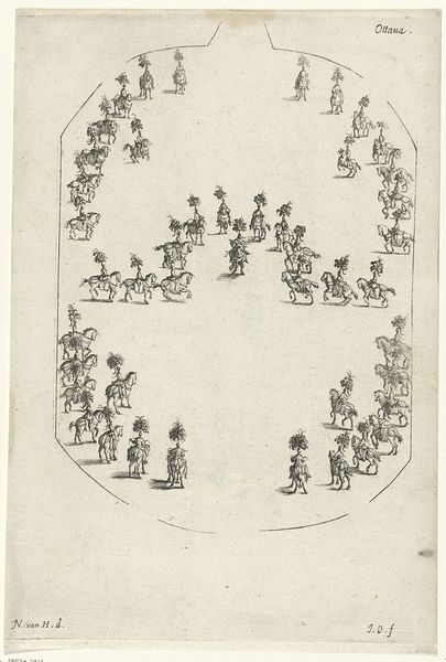 Curator: Here we have "Ruiterformaties (Terza)" by Jan van Ossenbeeck, dating back to 1667. It’s rendered in etching, engraving, and ink – a fascinating blend of techniques. Editor: It's like a meticulously arranged military parade or a complex dance choreography sketched out on paper. There's such a precise, almost regimented quality to the forms. Curator: Indeed. Ossenbeeck was known for his depictions of military exercises, often linked to the rise of Dutch power. This print likely captures the highly ritualized displays of equestrian skill prevalent at the time, almost propagandistic in their presentation of order and control. Editor: It also shows us a detailed and specific look at the material culture of the 17th-century military, from the horseshoes and bridles, to the plumes on the soldiers’ helmets. Consider how much labor went into making not only the artwork, but also those material goods for the army depicted. Curator: And the print itself would have served a function – circulating ideas about military prowess and potentially influencing artistic representations of power. We shouldn't forget the influence prints have on public opinion and perception. Editor: Thinking about the materials, etching and engraving were both labor-intensive. Creating the plate and making the ink required time, skill, and resources. Who owned these prints, and what sort of socio-economic context dictated access to images like this? Curator: Good questions. Certainly, such images would have circulated amongst the elite, reinforcing notions of order and hierarchy, of noble control. But printed images also served pedagogical purposes, influencing younger generations and creating visual grammars of acceptable representation. Editor: Ultimately, this piece provides us with more than just a scene of historical military exercise; it provides evidence of material processes, labor practices, and economic stratifications alive in Dutch society. Curator: A reminder of the interconnectedness between artistic production, material resources, and societal ideologies. Editor: Yes, and I appreciate having my assumptions of seemingly ‘high’ art challenged and connected to everyday processes.