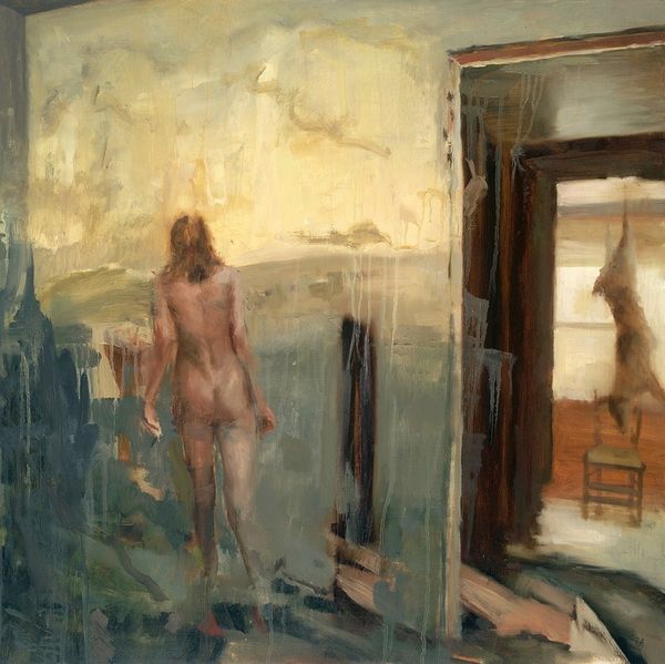 Curator: Jacek Malczewski’s “Satyr and a Model,” an oil on canvas from 1913. It’s quite a striking piece, wouldn’t you agree? What are your immediate impressions? Editor: A peculiar theatricality pervades the canvas. The satyr seems to leer, and the model, perched on that precarious ladder, strikes a deliberately nonchalant pose. There is an uneasy tension there that I think many people might recognize today. Curator: Absolutely. Malczewski often explored the complex dynamics between models and artists, infusing his works with symbolism tied to Polish identity and national aspirations within the context of the tumultuous early 20th century. The satyr in this case isn't merely a mythical figure; it represents a raw, perhaps repressed, aspect of the Polish psyche struggling for expression and freedom. The painting speaks to issues of representation, objectification, and the male gaze in ways that feel very contemporary. Editor: The ladder she sits upon, the interior and exterior views framed as well as the position of each subject do much to define social spaces and hierarchies. A ladder for access is here a type of ironic "throne." What did this imagery mean in terms of Polish social and cultural institutions? Curator: Considering the sociopolitical landscape of early 20th-century Poland, under partition and yearning for autonomy, the figure of the satyr becomes incredibly relevant. He could symbolize Poland’s complex relationship with its own sensuality and earthiness – the very essence of its identity – at a time when national survival depended on redefining the boundaries and structures of those same institutional and personal identities. Malczewski encourages the deconstruction of how power and freedom become, for Poland, intrinsically tangled together, revealing our deepest desires as individuals. Editor: It's compelling how Malczewski uses this mythological lens to examine power structures. Curator: Precisely, and by confronting us with the interplay of historical narratives and contemporary identity, Malczewski prompts a dialogue, and, through dialogue, an understanding of ourselves. Editor: So many ways to frame our relationship with the past through imagery! Curator: I’m glad we had this time to explore the work together!