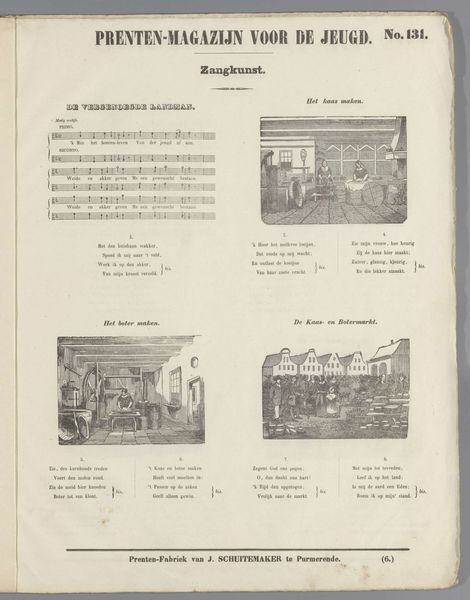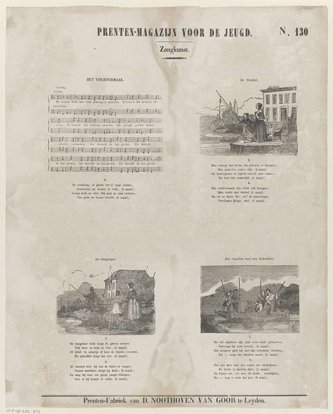 This is a page titled *Prenten-Magazijn voor de Jeugd Zangkunst* by Jan Schuitemaker, printed in Purmerende. It’s a children’s magazine that combines text, musical notation, and charming images. In the 19th century, when this was made, children’s literature was still a developing field, often used to instill moral lessons. The illustrations, depicting scenes of fishing and outdoor activities, present an idyllic, perhaps romanticized view of rural life. But this image is also interesting in what it leaves out. Where are the children of color, or those of different social classes? The sheet music itself points to the importance of communal singing and musical education in shaping young minds. These songs and images likely played a role in constructing a shared cultural understanding for Dutch children. Consider how simple images and songs can shape a child’s understanding of their world, and how these early influences resonate throughout their lives.