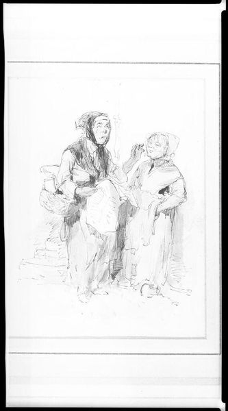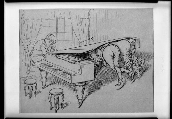 Curator: This is Adolf Oberlaender's drawing, "The Piano's Revenge: The Introduction," held here at the Harvard Art Museums. Editor: It feels like a stage—awkward and performative. Everyone is so stiff, even the fellow lurking in the background! Curator: Oberlaender was known for his satirical wit. Consider how the characters' exaggerated features and interactions might reflect social critiques of his time. What narratives might he be playing with here? Editor: Perhaps it's about forced interactions and the anxieties of social performance, especially considering the luggage—suggesting a journey or change. The woman being kissed seems far from pleased. Curator: Indeed, the composition directs our attention to the power dynamics at play, the way gender and perhaps class influence the exchange. Editor: I see a commentary on societal rituals—a snapshot of the discomfort inherent in formal introductions and the burdens they place on individuals. Curator: A pertinent reading. The drawing reminds us that even seemingly simple scenes are imbued with layers of historical and social meaning. Editor: It leaves me contemplating the unspoken rules that govern our interactions and how art can expose their absurdities.