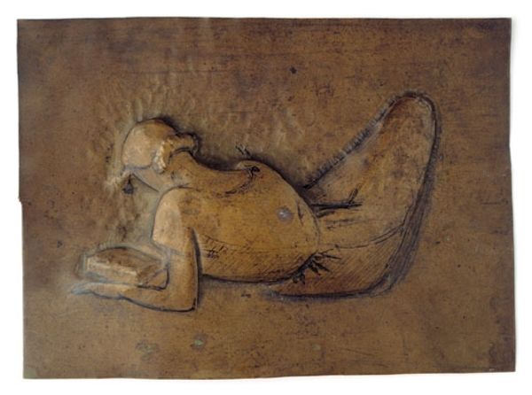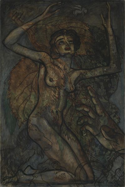 Editor: Here we have Mikhail Larionov's "Venus," painted around 1912, using tempera. I’m struck by how dreamlike it is, with this reclining figure almost dissolving into the background. The style is a far cry from classical depictions of Venus, wouldn’t you agree? What can you tell us about this image? Curator: Indeed! This work challenges traditional notions of beauty and the female form, reflecting a shift occurring in the early 20th century where artists began questioning academic norms. The crude, almost primitive, rendering connects to broader themes within the Russian avant-garde, where artists like Larionov were drawing inspiration from folk art and challenging the established artistic hierarchy. Notice the background figures, they seem almost like cave paintings. How does their presence affect your reading of Venus herself? Editor: I see what you mean. They make it feel less like a portrait and more like an archeological find or even a symbol. Curator: Exactly. Larionov situates his Venus within a broader cultural context, a history of representation perhaps, challenging the viewer to consider how concepts of beauty are constructed and evolve over time. The deliberate lack of polish and the use of simple, almost childlike, forms serve to disrupt conventional expectations of what art should be. Do you feel it is effective? Editor: Definitely. Seeing "Venus" treated in such an unorthodox way makes you think about why we consider some images "art" and others… not. It questions the institution of art itself, I guess. Curator: Precisely! The painting, beyond its aesthetic qualities, actively engages with the politics of imagery and the public role of art. It's a provocation. Editor: That gives me a whole new way of understanding it! Thanks. Curator: My pleasure! Seeing art as embedded within social and political contexts is vital to art historical thinking.