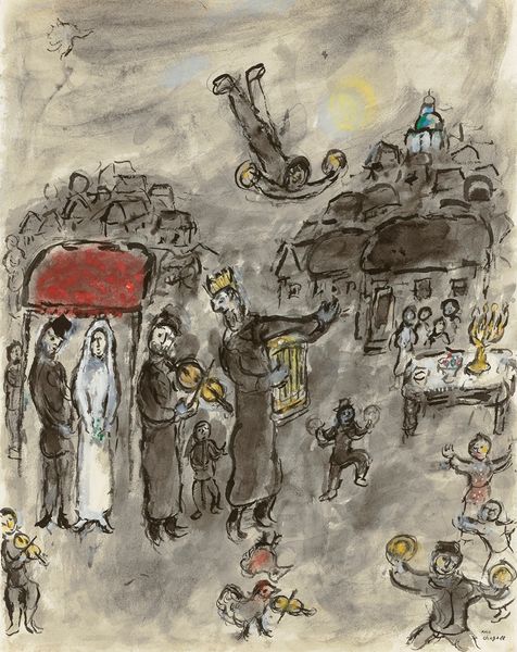 Editor: We're looking at Chagall's "Moïse et le veau d’Or" – or "Moses and the Golden Calf" – painted around 1966. It seems so turbulent and brooding, yet oddly tender with Moses clutching those tablets. What leaps out at you in this piece? Curator: Turbulent, yes, like a memory wrestling with itself! See how Chagall layers color, almost scrubbing it onto the canvas? It's like he's excavating the emotional core of the story. It’s not just about religious dogma; it's about temptation, faith, and, let’s be honest, human frailty. And the Golden Calf looming above... a fiery, almost comical symbol of our wandering desires. Don’t you think it adds a touch of irony? Editor: Absolutely, it does seem satirical! The crowd below feels lost too. They have very defined reactions. But the scale and palette is something new for this subject matter. How do you think the figures create emotion? Curator: Look closely, each figure is reduced to their basic essence. Think about Moses with the horns! The composition reflects chaos, doesn’t it? A direct visual language for mass dissent? Perhaps it suggests that we, as a public, struggle to navigate these complexities even today? But what would Chagall, with his floating lovers and fiddlers, have made of our digital golden calves? Editor: Food for thought, indeed! I love the way Chagall transforms a well-known story into something deeply personal and emotionally charged. It’s made me think about history as something that lives and breathes within us. Curator: Precisely. It seems as though painting, or life, only really bursts into true being if we are courageous and find our own unique language of the soul.