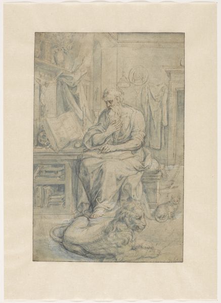 Curator: This is "To koner med huslige gøremål," or "Two Women Engaged in Household Tasks," a drawing by Heinrich Dittmers, dating from sometime between 1625 and 1677. It's currently held here at the SMK, the National Gallery of Denmark. Editor: My initial reaction is the somberness—almost a weariness—evoked by the limited tonal range. Even the activity seems subdued, focused inward. Curator: Genre scenes like these were highly popular during the Dutch Golden Age. They offer invaluable glimpses into the daily lives of ordinary people, though perhaps idealized through the artist's eye. Notice the detail given to the various baskets; Dittmers clearly valued rendering these mundane objects realistically. Editor: The baskets speak volumes, don't they? Baskets as vessels—containers of labour, perhaps even repositories of female roles rigidly defined within the patriarchal structures of the 17th century. We see one woman actively working, maybe weaving or mending, while the other watches, her position almost supervisory. The contrast feels significant. Curator: Interesting. And I’m particularly struck by how Dittmers' choices reflect the tastes of the era’s art market and patronage system. What social commentary, if any, was subtly included is still debated by art historians. How far were the female models accurately and sympathetically represented, when mostly viewed through male art dealers eyes. Editor: Absolutely. And looking at this from a contemporary perspective, we must ask: whose gaze are we seeing here? Whose narrative is amplified, and whose remains untold? What stories were intentionally left out, and who had the power to include them in the art world. This goes beyond art criticism. It asks larger questions about identity. Curator: Those are critical questions, vital for engaging with historical artwork today. Thinking of this pencil drawing on gray paper, this offers rich ground for exploring gender, labour and representation of art world production networks that extends across centuries. Editor: It's a small, quiet piece but potent—demanding a wider analysis on past times and artistic agency of both creator and models, I hope our observations today do them some justice in bringing them back to life.