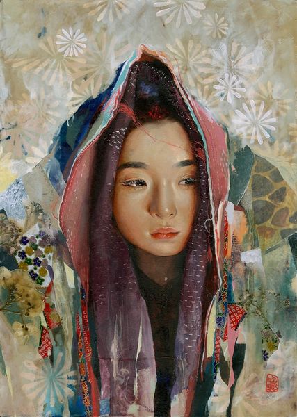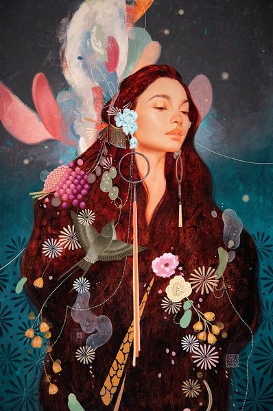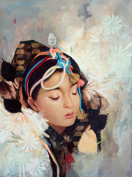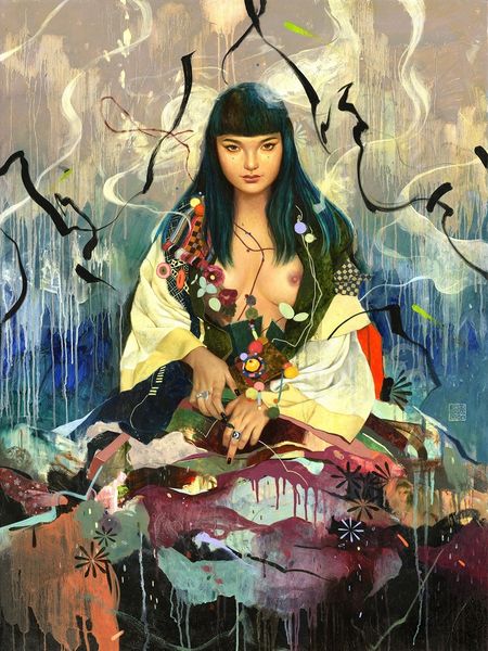 Soey Milk made this painting, Silver Dagger Headdress, with some kind of paint, I'm guessing acrylic or oil, and you can see right away that she's not afraid to let the painting process show. It’s like a dance between representation and pure abstraction. Look at how she’s built up layers of paint, scraping back in places, letting drips run wild. The blacks in the hair is so dense, but then she's added these little flower shapes over the top which make it feel light and playful. There are these tassels of blues and greens hanging down which is a lovely focal point. It’s like she’s inviting us to see the world through her eyes, with all its messiness and beauty. Reminds me a little of someone like Marlene Dumas, in the way she captures a feeling more than a perfect likeness. Ultimately, it's a painting that embraces ambiguity, leaving plenty of room for our own interpretations, and isn't that what art's all about?