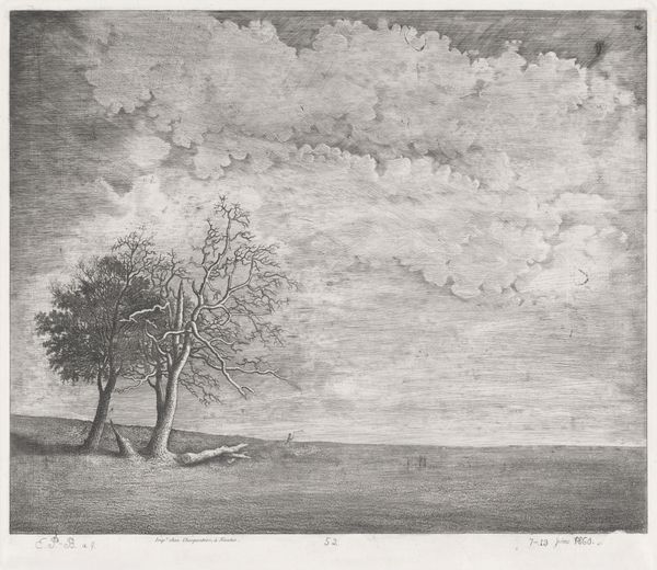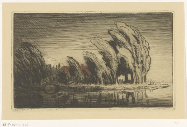 Wijnand Otto Jan Nieuwenkamp created this work, 'Gezicht op Haarlem', as an etching measuring 130 by 205 mm. The eye is drawn into a landscape dominated by looming, dark trees to the left, a dramatic sky, and the faint outline of a distant city. Nieuwenkamp plays with the stark contrast between light and shadow, creating a sense of depth and distance. The trees, rendered with dense, tangled lines, act as a kind of curtain, framing the expansive sky. The sky itself is a flurry of marks, a visual storm that suggests movement and perhaps even turbulence. Notice how the artist uses the etching technique to create texture, from the rough bark of the trees to the swirling clouds. The composition leads our eye towards the horizon, where the city of Haarlem sits like a mirage. In the distance, it grounds the ethereal quality of the sky and the emotional weight of the darkened foreground. This etching invites us to consider the relationship between nature, humanity, and the sublime, capturing a moment of dramatic beauty.