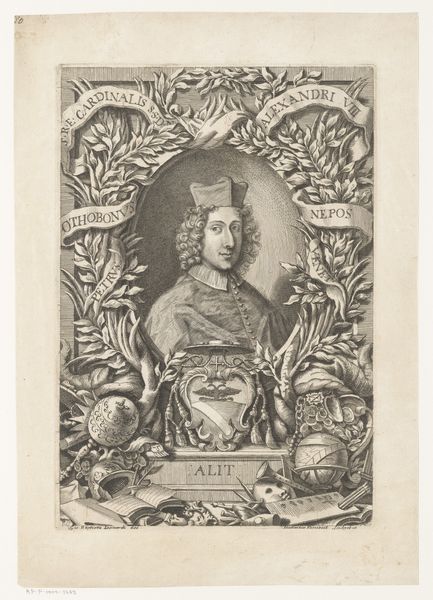 This is Frederik Bouttats's "Portret van Oliver Cromwell", an engraving printed on paper. The composition of the image strikes a balance between portraiture and symbolic representation. At the center, Cromwell is framed by an octagonal border, flanked by allegorical figures set against a draped background, which creates a layered visual experience that invites us to explore the interplay between representation and symbolism. Bouttats uses the formal structure of portraiture to make a statement about power and legitimacy. The octagonal frame around Cromwell is a geometric shape that breaks with traditional rectangular formats and suggests complexity. Note that the figures on either side, one holding a spear and the other crowned with light, are not mere decorations; they are structural elements that enhance Cromwell's symbolic importance. The elaborate drapery and ornamental details, when combined with the central portrait, offer a commentary on leadership. It's in this intricate interplay of form and content that Bouttats invites us to consider how an image can both represent and interpret historical figures. The formal elements are not simply aesthetic choices, but carriers of meaning and ideology.