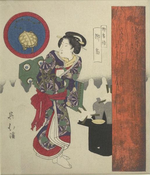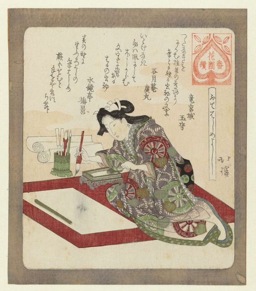 Curator: Here we have Totoya Hokkei’s print, "It is good to take a wife", dating from around 1822. This work, housed in the Rijksmuseum, is a woodblock print, showcasing the Ukiyo-e style so popular in its time. Editor: The title… and yet it's the stillness of the composition that really strikes me first. A kind of expectant pause, as if she’s considering the implications herself. The muted palette lends a gentle thoughtfulness to the piece. Curator: Yes, the print is particularly interesting from a production standpoint. These Ukiyo-e prints were not the singular work of an artist but involved a whole system of labour – the artist, the block cutter, the printer, and the publisher, each playing a critical role in the final product and its distribution. Editor: A collective creation then, intriguing. It makes you wonder about the individual hand within a supposedly unified aesthetic. Is there a ghostly fingerprint of the cutter, or printer woven within the woman's robe perhaps? The floral design on it does seem unusually vibrant against the subtle background. Curator: The kimono, rendered through the meticulous carving and layering of pigments on the woodblocks, certainly highlights the materiality involved. Consider too the economic and social context: who could afford such prints, what messages did they convey about beauty standards and marital ideals, and how did this imagery circulate within a rapidly changing Edo society? Editor: That brings another layer of emotion to it. Beyond the obvious presentation of the subject, I think about what it meant to acquire and possess such art during the Edo period. An early form of advertising then? "Buy our art and fulfill your domestic expectations.” Curator: Precisely, the print functioned within a complex system of patronage, production, and consumption, and understanding this history is crucial to appreciating the work's meaning. Editor: Looking at it through that lens makes it even more evocative. It is a conversation starter for those considering marriage – a tiny woodblock whispering across centuries. Curator: A valuable perspective to have for considering Hokkei’s work; a synthesis of technique, subject matter, and socio-historical relevance. Editor: Leaving me pondering, as always.