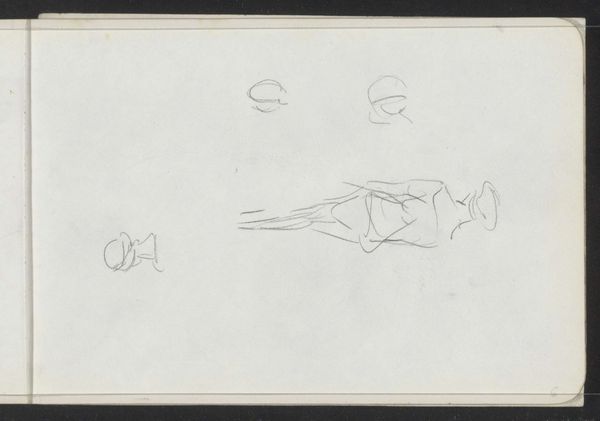 Editor: Here we have Isaac Israels' "Two Figure Studies," likely created sometime between 1875 and 1934. It's a pencil drawing, and it feels very spontaneous and free. What can you tell me about this piece? Curator: Well, let's consider the materials first. A simple pencil drawing allows for quick execution, suggesting the artist was more interested in capturing fleeting observations than creating a highly finished piece. The choice of paper too-- probably cheap sketch paper in a bound book? Consider where he might be making these sketches - at the beach, in a cafe. The economic conditions would play into this choice of readily available, affordable material. Editor: That makes sense. I was focused on the poses, but the actual materials tell a story about the artist’s practice. How does the process inform our understanding? Curator: Exactly. Look at the tentative lines. He isn't interested in a perfect, idealized body. He's depicting real people, probably working-class, relaxing or resting. The impressionistic style fits this – a snapshot of everyday life without glorification. Think about the art market at this time-- what were people buying? Did they want these rough sketches, or highly polished portraits of society's elite? Where do you think sketches like this would circulate? Editor: Maybe not in the mainstream galleries then. More likely in artist circles or perhaps as studies for larger works that haven't survived. So the value lies in their process and materiality because that contextualizes the labor that went into the high-status art of the time? Curator: Precisely! These figure studies offer us a glimpse into the artist's working method and, by extension, the world he inhabited and chose to depict through easily-acquired tools of pencil and paper. It shows that the act of *making* is just as important as any polished finished work. Editor: I hadn't thought about it that way. Looking at art through the lens of materials and their context gives such a fresh perspective! Thank you. Curator: My pleasure! It reveals so much more about the artist, society, and the art itself, doesn't it?