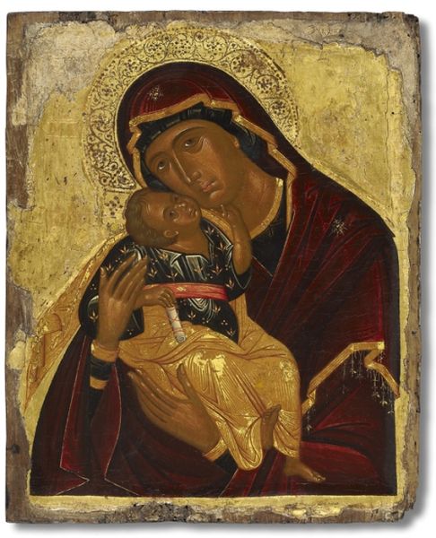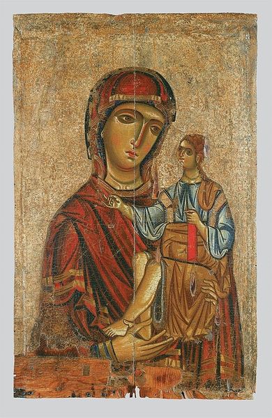 Editor: Here we have the "Episkepsis Glykophilousa," a mosaic icon from around 1300. Looking at the piece, I am immediately struck by the texture. It is all these tiny, hand-placed tesserae that form this tender image. What can you tell me about this choice of medium? Curator: Well, let's think about what mosaic signifies here, beyond just being a pretty image. The act of its creation, each individual piece being carefully placed, becomes a form of devotion and labor. Considering the cost of materials like gold, we need to think of who commissioned this and the value placed on the image. It signifies power and prestige through material wealth and the extensive labor required for its construction. What effect does this process and choice of material have on the viewer, do you think? Editor: It does give the piece a sense of permanence. Like this image will exist forever and always remind us of something holy. Given the religious context, were particular artisans sought for this laborious task? Curator: Exactly! Who do you imagine were the people actually involved in creating it? Think beyond just a single “artist.” We're talking about skilled laborers, probably working under very specific conditions. Each contributing to this powerful display of wealth and religious devotion. How does that labor then impact our interpretation of the image itself? Editor: It humanizes the image for me, knowing all the hands and hours that went into it. I see beyond just the divine figures represented and consider the cultural and societal elements. This piece illustrates labor and reverence together. Thank you. Curator: Indeed! By focusing on materiality and the processes of its creation, we reveal fascinating social layers embedded within the artwork.