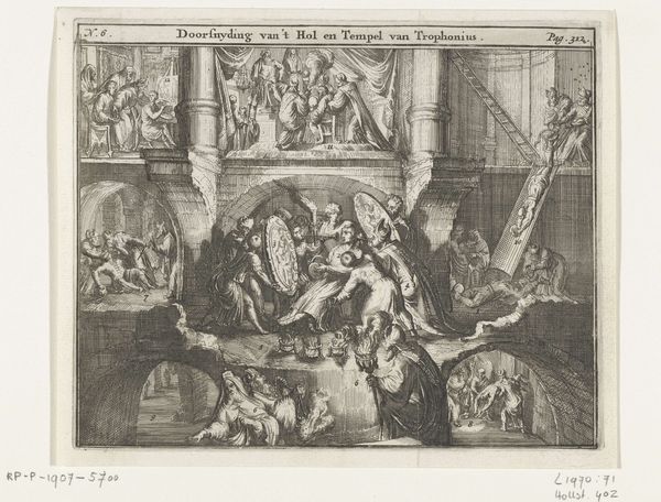 This is Adriaen Schoonebeek's 'Titelprent voor het tweede deel van 'Engelants schouwtoneel,' an engraving made around the turn of the 18th century, now held at the Rijksmuseum. Immediately, one notices the detailed, symmetrical composition, dominated by the regal figures of William and Mary. The texture, achieved through dense lines, creates a dramatic, almost theatrical effect. Schoonebeek uses allegorical figures and symbols to communicate power and authority. Note the sea creatures below, a stylistic choice that brings dynamism to the composition. The semiotic system at play here is clear: the monarchs are elevated, literally and figuratively, above the chaos and power that surrounds them. Consider how the artist uses scale. The monumental presence of William and Mary, combined with the carefully constructed symmetry, reinforces their dominance. Ultimately, the print can be seen as a statement about power, representation, and the construction of an ideal, demonstrating how formal qualities can serve broader cultural and philosophical purposes.