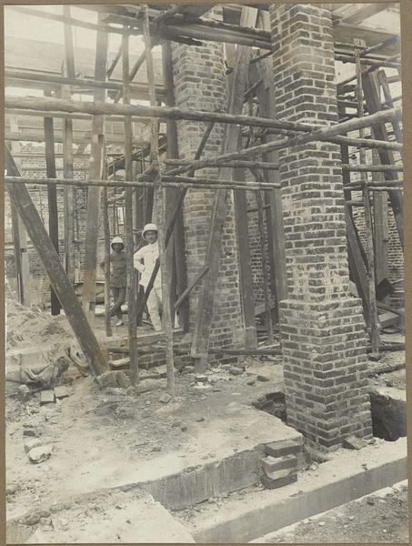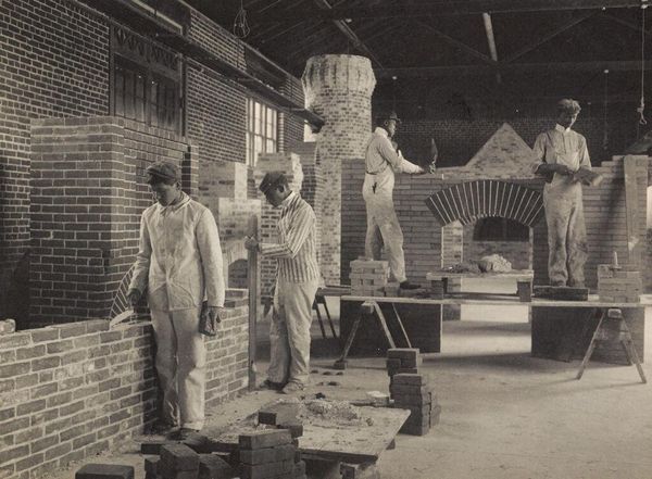 Editor: This sepia-toned photograph, "Defectives, Feeble-minded: United States. Massachusetts. Waverly. School for Feeble-minded: Massachusetts School for the Feeble-Minded.: Painting Class," by William A. Webster, shows a group of young men painting a brick wall. There's something deeply unsettling about the scene. How do you interpret this work within a historical context? Curator: Indeed. This image reflects the early 20th-century eugenics movement and institutional practices. The title itself is dehumanizing, revealing a societal attitude towards disability. Consider how photography, often perceived as objective, was used to categorize and pathologize individuals deemed "feeble-minded." What does it tell us about the power dynamics and social control of the time? Editor: It's horrifying to think of the image being used as a tool for dehumanization. I hadn’t considered how the act of documentation itself could be an act of power and control. Curator: Precisely. It forces us to question the ethics of representation and the role institutions play in shaping perceptions. This image is not just a document, but a statement about who was valued and who was marginalized. Editor: This has completely changed how I see the photograph. It's a stark reminder of the social and political forces at play in the history of art and representation. Curator: Agreed. It's a sobering reflection on the past and a challenge to be more critical of the images we consume today.