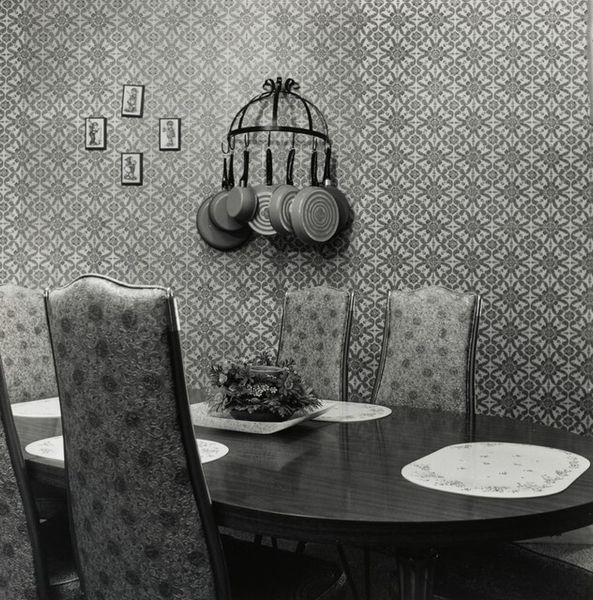 Editor: Here we have Lynne Cohen's photograph, "Future Furniture Co., Ottawa." The stark black and white contrasts with the whimsical cloud wallpaper, creating a very sterile yet bizarre environment. What strikes you about the image? Curator: The image presents a fascinating critique of office culture through its very construction. Consider the materials: the cheap cloud print juxtaposed with the veneer of the desk, a tension between manufactured nature and manufactured aspiration. How does this speak to the commodification of the workplace? Editor: That tension is clear. It's like a stage set, all surface. I wonder if Cohen's highlighting the artificiality of labor itself? Curator: Precisely. The photograph, as a product, becomes part of that cycle of representation and consumption. The materials and their arrangement expose the underlying processes of control and the illusion of escape. Editor: I see how her choices reflect on the broader economic landscape. The image now feels less random and more deliberate. Curator: Exactly, and hopefully it encourages one to think about the manufacturing of art and its impact on consumption.