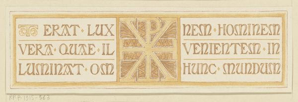 Antoon Derkinderen created this artwork, "Credo in unum Deum," using pen and brush in brown ink and watercolour. The phrase, meaning "I believe in one God", is carefully laid out in a horizontal band. Each letter is stylized, framed within individual squares that create a repetitive rhythm across the artwork. The decorative elements, such as the floral motifs within the letters, suggest a blending of the sacred with the aesthetic. This design choice destabilizes a clear distinction between religious text and artistic expression. Look at the interplay between line and color, with the subtle tonal variations giving depth to what could have been a flat design. The composition isn't just about conveying a religious message; it's about how the message is constructed, presented, and, ultimately, interpreted. The artwork's semiotic structure uses culturally recognized symbols and visual language to invite ongoing dialogue.