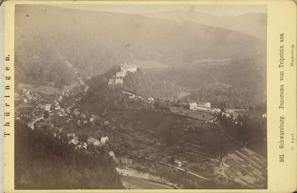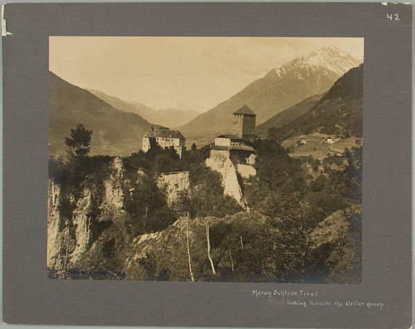Editor: This is an anonymous photograph entitled "Kasteel Runkelstein, nabij Bolzano," dating from 1885 to 1889. The monochrome image depicts a castle nestled into a steep mountainside. There's a strong sense of historical weight to this image... what strikes you most when you look at this piece? Curator: What grabs me is how this photograph subtly upholds societal power structures. This castle, a symbol of authority and control, is placed deliberately within this natural landscape. We need to consider how the "untamed" landscape is being framed to legitimise dominion. The very act of capturing it through the lens implies possession, a colonizing gaze, if you will. Does that framing speak to you? Editor: That's interesting! I hadn't considered it from a post-colonial perspective. It's easy to get caught up in the picturesque elements, but what you're saying reframes the whole image. Does the composition itself play a role in that power dynamic? Curator: Absolutely! The placement of the castle above and overlooking the valley reinforces a hierarchy. Then consider the rise of German Expressionism. Here, in a landscape of grand nature and history, is this quiet declaration of cultural identity emerging at the close of the nineteenth century. It silently echoes questions of national belonging and collective memory – particularly around German nationalism at this time. Editor: So, seeing the castle not just as an architectural feature, but as a symbol loaded with political and historical meaning, changes the way we view the whole scene. I’ll certainly be looking for this in other landscapes I encounter in the future! Curator: Exactly. This is just one reading, and I hope that by providing this context we enable other ways of considering landscape, power, and representation itself.