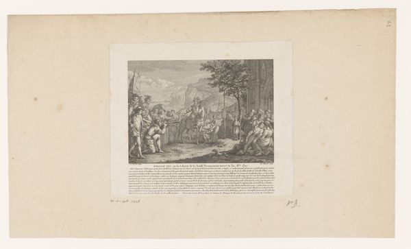 Editor: So, this is "Kindermoord te Betlehem," dating from around 1675 to 1727, by Claude Duflos. It’s an old print, so the paper has this lovely aged quality. The scene is quite chaotic, but the architectural background feels... almost staged? What can you tell me about this piece? Curator: This print throws into stark relief the performative nature of power and tragedy in the 17th and 18th centuries. The composition, while seemingly focused on the massacre itself, is equally invested in placing this event within a recognizable, almost theatrical, cityscape. Editor: The staged aspect. Yes! Curator: Precisely. Think about how power was visually disseminated. Prints like these circulated widely, shaping public perception of biblical events, but also subtly reinforcing societal hierarchies and the role of institutions, both religious and secular. Is this brutality really the focus, or does the "Kindermoord" provide an opportunity to showcase the power that oversees, judges, and records it? The pyramid, the classical architecture - it places the scene both in the past and symbolically elevates it to a near mythical status. How do you think such a composition may shape our reading of the religious narrative? Editor: It's almost desensitizing. By placing the violence within this grand setting, the human suffering feels… less immediate. The architectural references dominate the scene, while the families are in the margins. Curator: Exactly! It highlights how artistic representations of historical or religious narratives are never neutral. They're always embedded within socio-political contexts and served to reinforce, or occasionally subvert, existing power structures. Editor: This really makes me reconsider how art serves these broader cultural functions, shaping our understanding beyond just the aesthetic experience. Curator: Indeed. And appreciating that historical context enables a much richer reading of what is actually going on within the frame.