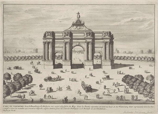 This is an undated engraving of the Arch of Constantine with the Colosseum in the background, created by an anonymous artist. The composition is dominated by the arch, rendered with meticulous detail. Note how the architectonic structure is framed against a backdrop of billowing clouds and distant classical ruins. Observe the sharp lines defining the arch's form against the Colosseum’s elliptical shape, creating a contrast between the immediate and the remote. The artist uses line and perspective to draw the eye through the arch toward the iconic amphitheater. The figures in the foreground add a human element that invites viewers to imagine themselves within this historical landscape. The semiotic interplay between these classical structures—the arch as a symbol of triumph and the Colosseum as a stage for public spectacles—engages themes of power, memory, and representation. This image offers more than just a visual record; it is an interpretation of Rome's enduring impact on the Western imagination.
