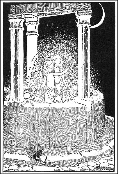 Dorothy Lathrop made this fairytale illustration using pen and ink, letting the stark contrast of black and white tell its story. This drawing feels more about the process of its making than a need to capture a specific scene. See how Lathrop varies the marks? Some areas are defined by tightly packed parallel lines, like the scrubby trees, while others, like the castle walls, are outlined with clean, steady strokes. It's as though Lathrop is exploring different ways of describing form and texture with her pen. Take a look at the sky, the field of stippled dots creates an atmospheric background that contrasts with the solid forms of the figures below. It’s a playful use of texture that feels both intentional and a little bit random. Lathrop's work has something of the magic of Arthur Rackham, who knew how to conjure a sense of wonder with simple lines. But the real treasure here is Lathrop's willingness to let the drawing unfold.