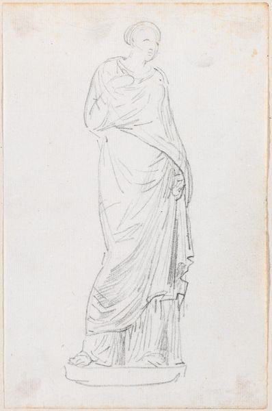 Editor: Here we have Hubert Robert’s "Statue of Zeus Holding a Thunderbolt," a pencil drawing from around 1760. The rendering feels both classical and a bit ghostly. What stands out to you? Curator: Immediately, the focus is drawn to the linear structure. Robert’s economy of line is striking, creating a figure monumental in implication yet rendered with a seeming lightness. Consider the interplay between the draping fabric and the revealed musculature; the contrasts generate a dynamic tension. Editor: It's interesting that you focus on the lines and structure. Did Robert make preliminary sketches before moving onto more detailed artwork? Curator: Quite possibly. Think of this work as an exercise in form. The absence of color amplifies our attention to tonal variations achieved purely through the pressure and density of the pencil. Notice the almost diagrammatic quality in certain areas. How does this impact your understanding? Editor: It's like he's dissecting the statue, focusing on its fundamental shapes rather than a perfect likeness. What would you say is most evocative formal element within the composition? Curator: It must be the unresolved hand, suspended in air, still clasping the implied thunderbolt. The very incompletion provokes an engagement; we, the viewers, are invited to complete the image in our minds, adding to Zeus' power and presence. Editor: That's a fascinating way to put it. I had been looking at the draping, but I see how the open-endedness contributes something unique to the piece. Curator: Precisely! It demonstrates the latent potential inherent in the formal elements themselves, regardless of representational accuracy. A lesson for us both.