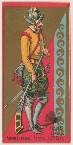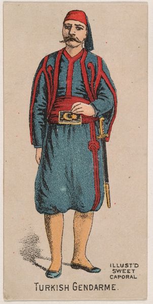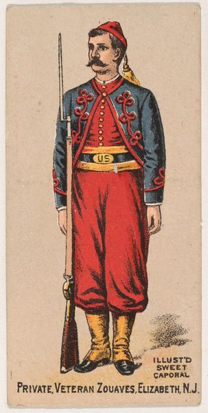This small chromolithograph was created by the Kinney Brothers Tobacco Company as an advertisement for Sweet Caporal Cigarettes. It depicts a Corporal of Zouaves, a branch of the French army known for its distinctive North African-inspired uniforms. These cards were made during a time of increasing French colonialism. Zouaves, initially composed of North African soldiers, later included Europeans, yet they retained their exoticized dress. The image thus speaks to France's complicated relationship with its colonies, simultaneously celebrating and appropriating foreign cultures. It also encouraged a sense of national pride. The commercial image flattens complex histories into easily consumed images, subtly promoting imperialist narratives alongside tobacco products. Consider the power dynamics inherent in such representations, and how the commodification of cultural imagery continues to shape our perceptions today.