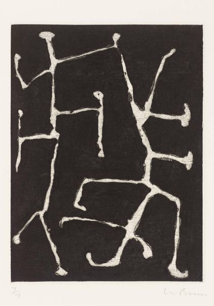 Editor: This print by Christopher Le Brun is untitled and uses dark monochromatic marks that seem to weave in and out of each other. What stands out to you in this piece? Curator: Notice how the pale, almost skeletal forms suggest both growth and decay, evoking the cyclical nature of life and death, a theme prevalent in vanitas imagery. Do you see any symbolic resonance in the interwoven shapes? Editor: I see that now! I hadn't considered the deeper symbolism at first. Thanks. Curator: Consider also how abstraction allows for a more direct engagement with our subconscious. The symbols are there, but they are felt as much as they are seen.