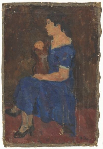 Editor: This is Spencer Gore’s "A Singer at the Bedford Music Hall." I’m struck by how the broad strokes of paint almost flatten the figure. What's your take on Gore's approach to materials and representation here? Curator: Gore's choice to depict a music hall singer in such a deliberately unrefined manner challenges the traditional hierarchy between high art and popular entertainment. Note the visible brushstrokes; they draw attention to the labor involved in the painting's creation. Editor: So, the painting itself is highlighting its own production? Curator: Exactly. The materiality of the paint and canvas becomes part of the subject matter, reflecting the cultural value placed on both the singer's performance and Gore's artistic practice within the social context of the music hall. What does that imply for the audience of the work? Editor: It makes me consider how the work asks us to think about the value of labor in art and entertainment. Thanks, I hadn't considered that! Curator: My pleasure. These paintings show the artist's interest in representing the everyday.