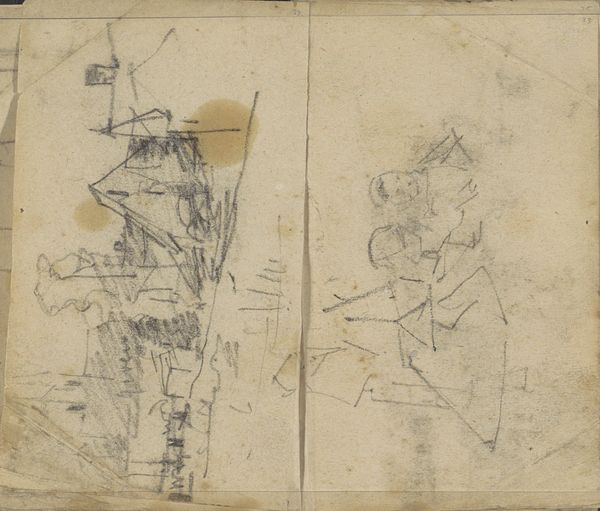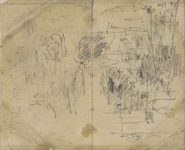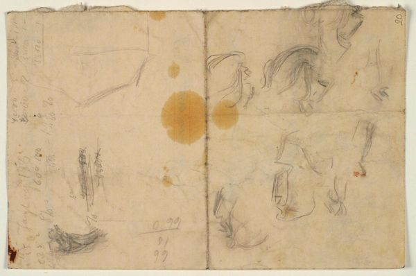 Editor: This is Dankvart Dreyer’s "Udkast til et billede med bakker, forskellige studier af landskaber, planter en hund etc.” a drawing from the 1840s, currently housed at the SMK. There’s a real sense of immediacy in these sketches. It feels like we're looking directly into the artist’s notebook. What stands out to you? Curator: The aggregation of symbols tells a layered story, doesn't it? Consider the dog—a creature of loyalty, domesticity. Then, the studies of landscapes, evoking a yearning for nature, for the untamed. These visual motifs, set against what appear to be architectural sketches, suggest a push and pull, a tension between the cultivated and the wild. Editor: That's interesting, I hadn't considered the contrast between domesticity and the wild. The architectural sketches seem so precise compared to the more free-flowing landscapes. What do you think that tension represents? Curator: Perhaps a commentary on society itself. The dog, a symbol of tamed nature within the home; the landscapes, a reminder of what lies beyond the structured environment; and the buildings, representing civilization's encroachment. Dreyer gives us a glimpse into the romantic soul, grappling with the changing world around him. Are those architectural sketches houses? Do you recognize anything else of interest? Editor: Now that you point it out, some of the landscape elements seem like callbacks to earlier Romantic paintings. But I wouldn't know where to start looking! It almost seems like he is writing notes to himself about things he wants to study later. Curator: Indeed. Dreyer presents us not with a finalized piece, but an act of visual thinking, of collating symbols laden with historical and personal weight. The image reminds us of culture, and it challenges us to decode its layers, in order to gain more meaningful appreciation for the romantic and realist elements within a single work of art. Editor: That makes me consider my own notebook – how symbols I collect might also reveal what's on my mind! Thank you for that enlightening experience!