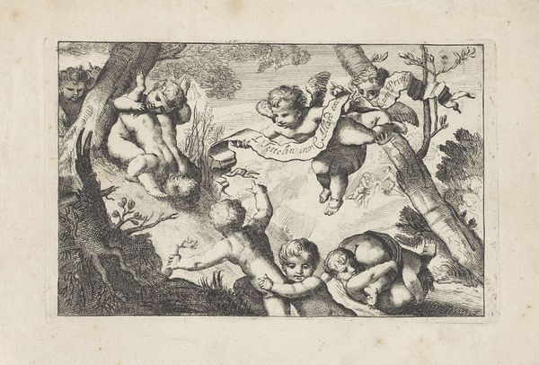 This print, made by an anonymous artist, presents a scene of putti playing before a tent. The image offers a glimpse into the cultural values and artistic conventions of its time, likely made somewhere in Europe. These cherubic figures, reminiscent of classical art, frolic in a playful manner, embodying innocence and joy. The tent in the backdrop hints at a staged setting, perhaps alluding to theatrical performances or allegorical narratives that were popular in aristocratic circles. Prints like these were often reproduced and circulated widely. They served as a means of disseminating artistic ideas and cultural values to a broader audience. The absence of the artist's name suggests a focus on the image itself, rather than individual authorship. Further research into the printmaking techniques and the cultural context of the time could reveal more about its production, reception, and the social function it served.