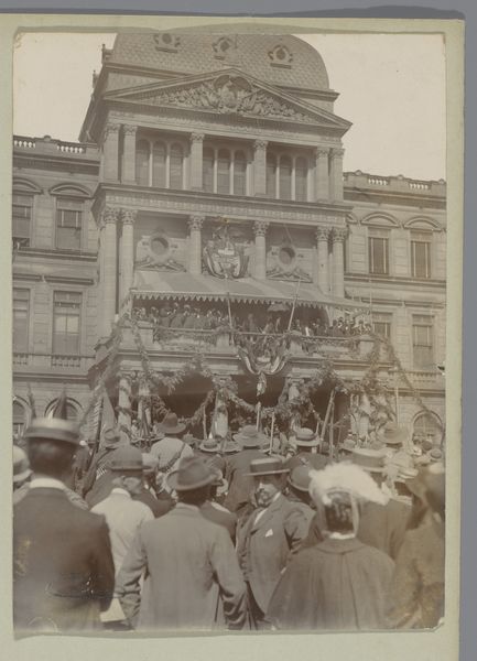 Barend Groote created this photograph of Queen Wilhelmina's inauguration on Dam Square in Amsterdam. The sepia tones lend the scene an antique quality, which gives way to a stark contrast between the organized military presence and the dense crowd. The photograph's structure relies on a deep perspective, drawing the eye from the foreground throng to the distant buildings. The architecture is rigid and geometrical, which contrasts with the organic mass of people. This juxtaposition highlights the tension between institutional power and public emotion during the event. The flags and banners act as signifiers of national identity and festivity, while the military formation suggests order. The composition and structured arrangement point to a controlled, staged event. It’s a moment of symbolic importance, mediated through carefully constructed visual codes of power.