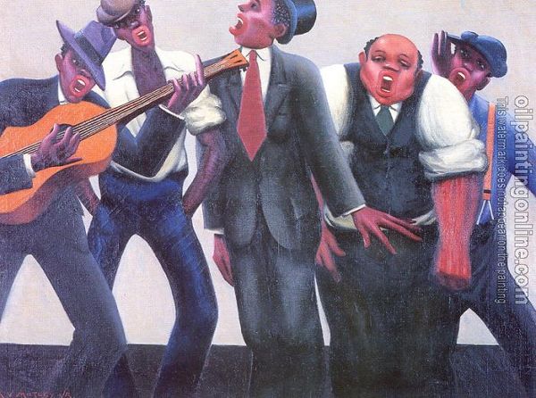 Archibald Motley made this painting, it's called 'The Liar', and it's an oil on canvas. Look at the way Motley builds up his colours, especially in the figures' faces. He seems to be finding form through the act of painting itself. The texture in this piece is really something – you can almost feel the smoky atmosphere of this crowded room. Notice how the colours pop against the dark, shadowy background. There’s a real energy in the way Motley applies the paint, creating a sense of movement and liveliness. Now, focus on the figure leaning back on the chair in the foreground. The way the light catches the planes of his face is really fascinating. Motley's work reminds me a little of Jacob Lawrence, another artist who was exploring Black life and culture in America, or maybe even Romare Bearden. But Motley's got his own distinctive voice, his own way of seeing the world. Ultimately, this painting is less about telling us a story and more about inviting us to experience a moment, a feeling, a vibe.