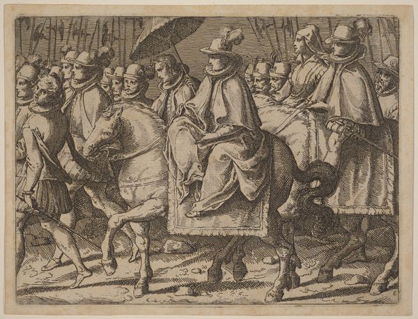 Editor: Here we have Christoph Bockstorffer's "The Pardoning of a Criminal," made in 1531. It’s an ink drawing, woodcut, and pen on paper, currently housed here at the Met. I’m immediately struck by how busy the composition is; all these figures crammed together in this shallow space. How do you interpret this work? Curator: This piece is densely packed, as you say, a characteristic we see often during the Northern Renaissance. Look closely: what figures dominate the scene, and what actions are they performing? I find it helpful to consider this as an allegory. The pardon becomes a very loaded symbol here. Editor: Well, the pardoned criminal kneeling definitely catches the eye. Everyone is gathered around him, almost like they're observing. But the figures on horseback, they have a more commanding presence. I suppose I hadn’t really considered it symbolically before. Curator: Exactly. The act of kneeling, the gaze of the crowd, these create a particular tension. The horseback riders could represent authority or power; are they bestowing mercy or simply maintaining order? Notice also how the hanging sign overhead almost mimics them and feels intentionally balanced with them. What feelings does it evoke when you examine these relationships? Editor: It feels like there’s a question of power being asked here. Who has it, how is it used, and who gets to decide someone is worthy of pardon? Also that sign! It does seem intentionally balanced with those figures to really emphasize the ideas of balance and consequence. Curator: Precisely. Think about what 'justice' and 'mercy' might have meant in 16th century Europe and consider what kind of psychological impact this scene of pardon might have had then and even now. These are enduring themes, aren't they? Bockstorffer captured a potent cultural narrative. Editor: It definitely makes me think about those questions, and the act of public pardon feels way more complicated and political now. I didn’t expect to read so much into a drawing! Curator: Symbolism provides lasting dialogue. A work like this serves as a reminder of how we’ve always grappled with concepts of justice and forgiveness, publicly and privately.