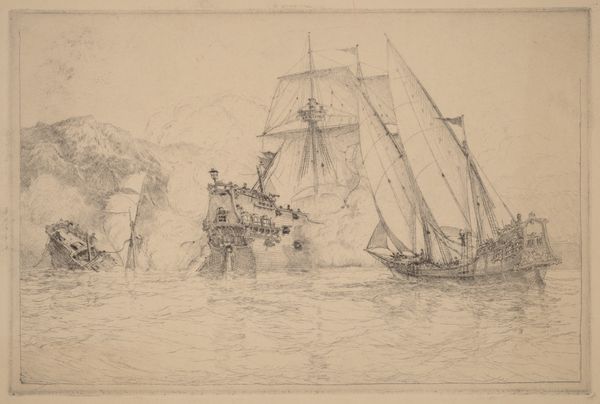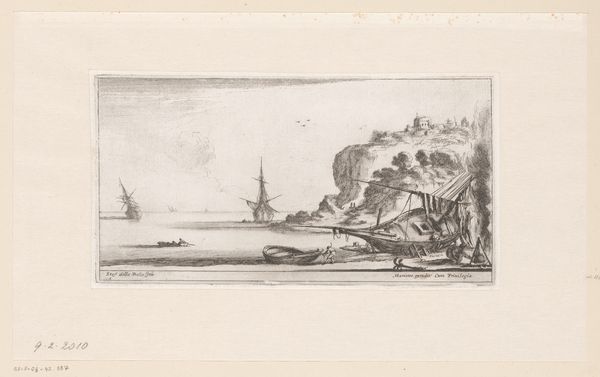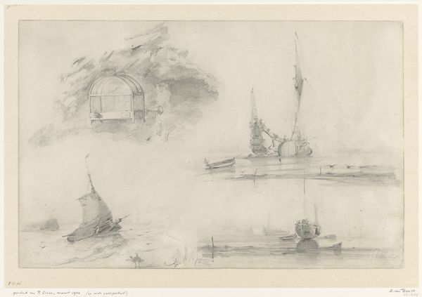 Curator: Here we have a landscape, "River View on the Rhine," rendered in pencil and etching on paper by Andreas Schelfhout. It's currently held here at the Rijksmuseum. Editor: There’s a stark tranquility about it. The hazy pencil strokes almost dissolve the details into a wistful scene. Curator: Schelfhout was known for his plein-air drawings. They reflect the artistic and social embrace of nature during the 19th century. But also served as studies to be turned into paintings later in his studio. Editor: The loose rendering gives it the feel of a quick observation. I’m wondering what role the river plays in shaping community—for livelihoods, transportation. Were the people who relied on it facing new struggles or challenges? Curator: The Rhine was a crucial artery for trade and travel, yes. Drawings such as these also romanticized the local. Focusing on a natural simplicity distanced from rapid industrialization. They acted as a sort of imagined past as society around them radically shifted. Editor: Exactly. I see both appreciation and a certain idealized escape from the very real economic inequalities and urban disruptions that rivers like the Rhine both enabled and exacerbated. The romantic portrayal obscures labour—we only get the pleasure craft, never the freighters carrying resources appropriated in colonial spaces that are actually feeding this river-based economy. Curator: The figures depicted do seem content. Yet landscape as a genre has often served very specific political and cultural purposes, promoting notions of national identity and territorial ownership, ideas still at play today. Editor: Yes, the act of observation is never politically neutral. Whose stories are deemed worthy of representation, and what is deliberately left out, is revealing of how power operates through these idyllic vistas. It’s this dynamic of celebrating the beauty while being mindful of its complicated context, that draws me to the work. Curator: For me it is more the window into how these artists perceived the changes in their world. It reflects both a visual record, but an insight into the changing public life. Editor: It's an invitation to consider whose vision of the "good life" is being subtly reinforced, a reminder to look at any landscape with a critical eye.