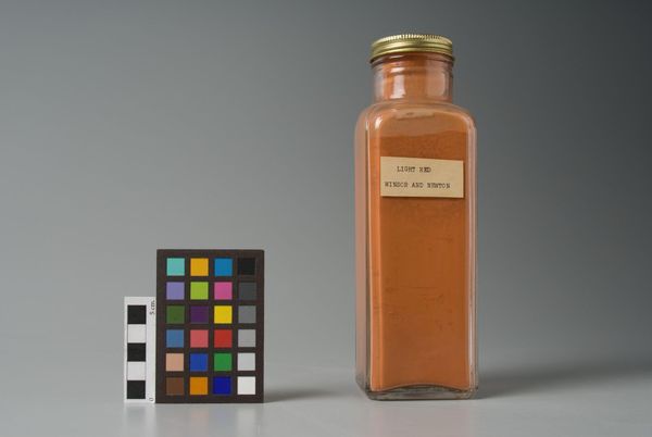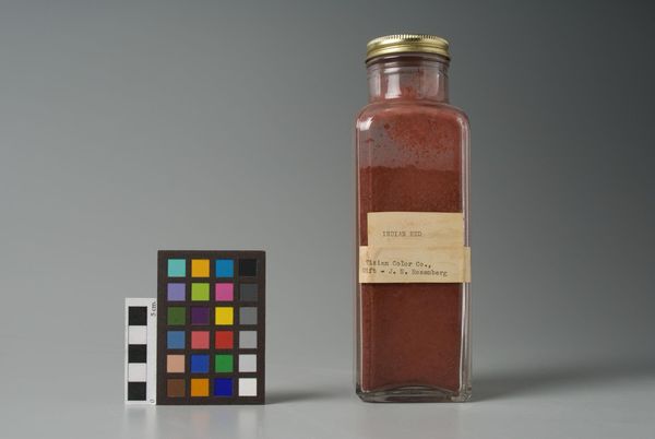 Curator: This is "Burnt Sienna," a manufactured pigment from the Tizian Color Company. Editor: Its quiet stillness makes me think of Morandi; a meditation on form and color. Curator: Exactly! The manufactured nature allows us to consider the industrial processes involved in producing art materials, and the consumption of such materials. Editor: Yet the pure color, contained within that clear glass, is all that matters; the composition is stark, drawing all attention to the sienna itself. Curator: But don't you think the label also serves to remind us of commerce? The commodification of art itself, as it were? Editor: Perhaps, but to me it frames the subject beautifully, enhancing the visual impact, almost like a painting. Curator: Intriguing to consider art from these different angles. Editor: Indeed, each perspective enriches our understanding.