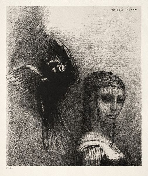 This lithograph was made by Odilon Redon, using a rather ingenious method that involves drawing with a greasy crayon on a stone, then treating it chemically so that ink adheres only to the drawn areas. Redon was fascinated by the velvety blacks and infinite gradations of grey he could achieve. The resulting prints have an uncanny, dreamlike quality, ideally suited to his symbolist imagery. Consider the work involved: not just the artist’s initial drawing, but the skilled labor of preparing the stone, and the repetitive work of printing each impression. It's a commercial medium, intended to circulate widely. The grainy texture evokes the mysterious. The richness of tonality, built up through layers of skilled labor, invites us to look closely, and to consider the connection between the image and the means of its production. It reminds us that even the most ethereal visions are grounded in material processes and social contexts.