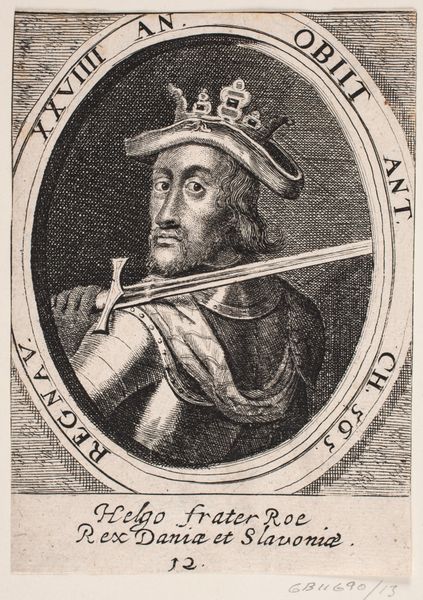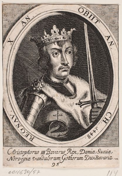 This print of Erik Plovpenning was made using engraving, a process where an image is incised into a metal plate, inked, and then printed onto paper. The material quality of the print—its crisp lines and fine details—results directly from the engraver's skilled labor. The image is built up through careful, precise cuts into the metal, demanding years of training and a steady hand. These skills were acquired through long apprenticeships; they are far removed from the quick reproduction of the digital era. Consider the social context: prints like this circulated widely, enabling the dissemination of royal imagery and solidifying power. The act of engraving transforms the monarch’s image into a commodity, available for purchase and distribution, thereby playing an integral part in early modern visual culture. By considering the material and the making, we can appreciate the artistry inherent in this humble printed image. It challenges our traditional understanding of 'art' by highlighting the essential roles of craft, labor, and social context.