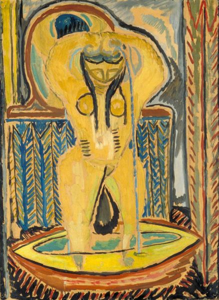 Curator: The overall feeling, even at a glance, is almost reverential, don’t you think? A little solemn, but certainly quite pleasing. Editor: Indeed. Let me orient our listeners. What we have before us is “White Blossom in the Garden,” an example of Paul Klee's distinctive, abstract style, created around 1920. It combines pastel and watercolor to generate a textured, somewhat dreamlike depiction of a landscape. Curator: That’s true. The planes of greens, yellows, and blues definitely create a sensation of receding space, yet the flower itself is almost aggressively flattened. What does Klee gain by suppressing a conventional perspective? Editor: Perhaps the artist seeks to synthesize the material garden with its essence. In the wake of the first World War, nature offered solace. But in German Expressionism, you’d often find anxiety or social commentary mixed with visual delights. I imagine the carefully delineated boundaries within the composition might symbolize societal structures—ordered, yet confining. Curator: Yes, there's an imposed geometry. The curvilinear shapes struggle within those strictures. Note how Klee's restricted palette adds to this sense of tension, each hue carefully positioned to amplify contrast and achieve maximum visual interest, despite the obvious repression. Editor: It is an era marked by constraint, with governments cracking down and the spectre of hyperinflation looming large. Klee was part of the Bauhaus movement—an incredibly vital period for questioning form and function in the hopes of building a better world, so to consider societal reform when viewing his painting doesn’t feel like much of a stretch. Curator: True, and within this small watercolor, Klee wrestles with tensions through his art. His personal vocabulary feels potent yet strangely intimate. The delicate flower asserts itself but stays carefully within bounds. Editor: An ordered hope for a better future, viewed from within the confines of a broken system? Curator: Perhaps. Though, ultimately, as viewers, it’s the pure act of beholding the composition's internal harmonies and frictions that I find to be Klee's enduring achievement. Editor: I see how the composition prompts that formal appreciation—for me, this small painting speaks volumes about the artist's commitment to weaving the personal with public struggles.