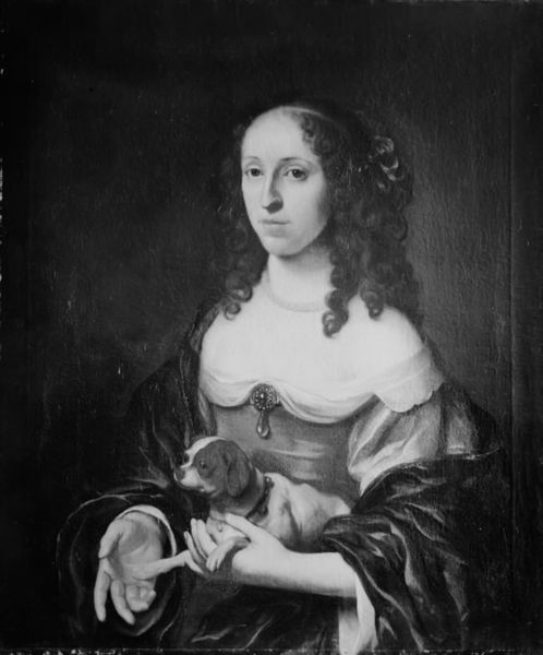 Curator: Immediately striking is the dramatic chiaroscuro! The stark contrast between light and shadow creates such a dynamic and almost theatrical effect. Editor: Indeed. This portrait, entitled "Dame i venetiansk karnevalsdragt," by Andreas Møller, thought to have been created sometime between 1699 and 1762, is quite captivating. It is an oil painting on canvas. One immediately thinks of the elaborate fashions of the time and how those styles represent a sort of social fabrication, something performed through costuming. Curator: Precisely! And look at the textures – the lace, the silk. The artist has meticulously rendered each element. It is almost tangible. I’m intrigued by the overall lack of color... Editor: Given that its monochromatic nature restricts our reading to tones and surfaces, it makes me want to analyze the production of black pigment. What source did Møller turn to? What social history might that material hold? Were sumptuary laws challenged? Curator: I think you are absolutely right, though I find my gaze directed towards the subject’s gaze! It’s so direct, engaging. It makes one feel implicated, observed, if you will. It transcends its mere function as a portrait to invite, even demand, our attention. It challenges assumptions. Editor: Certainly. It does appear that this “history painting” is concerned with the means and displays of wealth during the Baroque period, but also invites close analysis through our modern sensibilities of power, wealth, labor, and privilege, right? Curator: I see it that way too. Its austerity makes a complex conversation approachable. Editor: Well, that is definitely food for thought. Curator: Indeed. What an interesting artwork.
