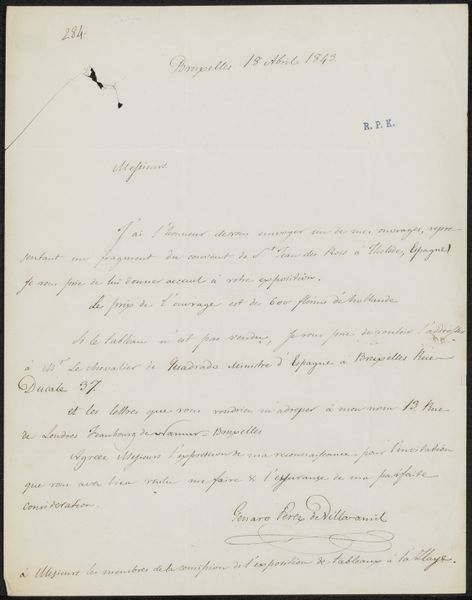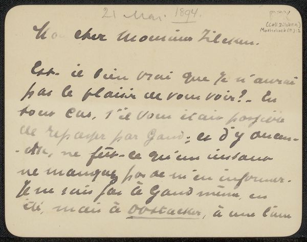Editor: This is "Brief aan Philip Zilcken" by Hélène van Goethem, probably from sometime between 1913 and 1929. It's ink on paper – a handwritten letter, it seems. There's something incredibly intimate about seeing someone’s actual handwriting, a direct connection to their thoughts. What jumps out at you? Curator: What fascinates me is the raw materiality of this letter. We have ink, paper, the physical act of writing. The paper itself tells a story, its texture, the way it's aged. Think about the social context: letters were crucial for communication, forming connections and conducting business. This wasn't mass-produced; each stroke of the pen involved time and effort, representing a particular social practice that requires analyzing the mode of production and reception of it. Do you consider the letter to Philip as an artwork by itself, or rather a tool? Editor: I see your point. The labor involved is definitely something you lose in our digital age. I guess I had considered it more as a historical document. It’s interesting to think of it existing in that area between artwork and practical tool. How does focusing on the materiality affect how we see Van Goethem as an artist? Curator: It challenges the traditional idea of the artist as solely a creator of fine art. Van Goethem’s labour in producing this letter becomes relevant. This isn't necessarily about artistic genius, but about process, about communication and social exchange, using the material tools at her disposal. We begin to understand the networks she worked within. Look at the list of names and addresses; these are all elements of a lived, material existence, not just abstract ideas. Editor: That’s a helpful perspective shift. By focusing on the letter’s materiality and function, we get a richer understanding of Van Goethem and her world. Curator: Precisely. It urges us to expand our concept of art and consider it as an activity deeply embedded in social and material relations.