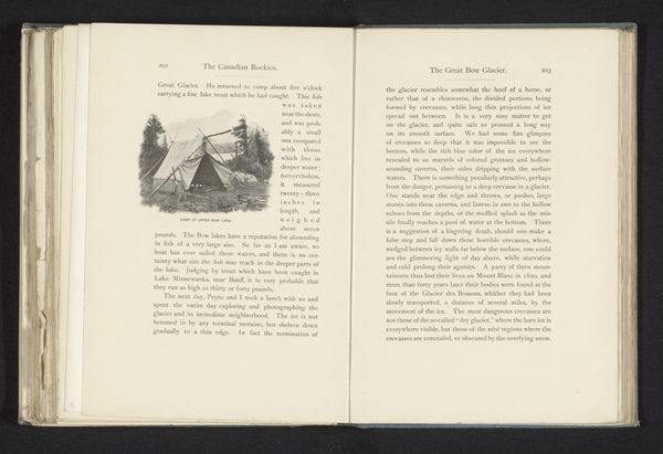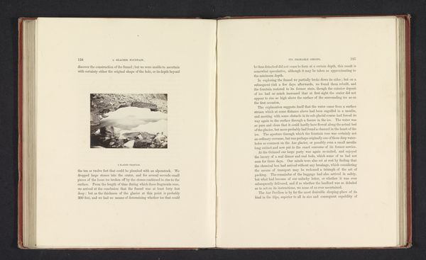Curator: Looking at this albumen print from before 1866 titled "Final fall of Unter Grindelwald glacier" by Ernest Edwards is fascinating, especially when considering photography's role in shaping perceptions of the natural world. Editor: Absolutely! It's really interesting seeing the glacier framed like this, within the pages of a book. The way the image is presented, surrounded by text, almost makes it feel like a scientific document. I’m struck by how…stark it is. What stands out to you about this work? Curator: What jumps out is the context of viewing this image. We're not just seeing a glacier; we're seeing it as part of a deliberate project of documentation and dissemination. Early photography, especially landscape photography, played a key role in constructing ideas of the sublime, but also in promoting scientific understanding and even tourism. The question here is: who was this book for? What purpose did images like this serve in that particular historical moment? Editor: That makes me think about how photography democratized the viewing of landscapes. Did this photograph serve a different purpose than, say, a painting of the same glacier would have? Curator: Definitely. While paintings often emphasized the romantic aspects of nature, photography, at least initially, carried the weight of scientific accuracy and objectivity. This image could have been used to illustrate geographical or geological studies. But it also brought remote locations into the homes of people who might never have a chance to see them in person, influencing ideas about landscape and travel. Consider the social class of individuals who could afford this book as well. How does their identity and social position influence our perspective of this photograph? Editor: So, it’s less about the individual artistry and more about the societal function of this kind of imagery? Curator: It's both, really. The photographer, Edwards, clearly had artistic choices, but they were also operating within certain social and scientific expectations of what a photograph should be. Examining the image as part of a larger system of knowledge production opens up some interesting questions. Editor: This conversation really shifted my perspective. It is no longer just a picture, but it's a part of this big historical narrative! Curator: Exactly! Hopefully, others viewing this photograph begin thinking of that very idea.