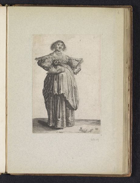 Curator: Before us, we have "Standing Woman with a Fan and Apron in a Landscape" from 1784. Robert Brichet created this intriguing engraving, which is now part of the Rijksmuseum's collection. Editor: She appears both playfully defiant and rather… cautious. Her stance is almost guarded, but the ruffled apron and feather in her hat suggest a different story. Curator: Yes, there's a wonderful tension. Her crossed arms certainly hint at a barrier, but consider the apron and pockets—a nod to everyday life, but adorned with lace and ribbons. And the fan; a symbol, wouldn’t you say, of the power held by women. Editor: Precisely! The Rococo era certainly loved its delicate accessories, but here, it almost feels subversive. Is Brichet making a point about the artifice of femininity, about the labor masked by elaborate display? She seems like a symbol for new emerging feminist views, or, in the very least, an argument for greater agency for women. Curator: Absolutely, and those pockets! So often hidden, here they are quite prominent. Pockets were becoming more important during this time. They represent self-sufficiency. That really lends itself to a message about women at the time. Editor: Note too the landscape, simple yet evocative, acting almost as a stage. It grounds her, gives her context. There’s a rural sensibility—uncommon in Rococo portraiture—that feels fresh, almost revolutionary. Curator: Yes, Brichet deviates from typical depictions of the time, it is this raw immediacy that elevates the print, capturing a moment, and perhaps a shift in societal perspectives. Editor: What I see now is an icon of quiet rebellion. Not in grand gestures, but in the subtle presentation of self, purpose, and understated dignity. Curator: Indeed, Brichet’s print is far more than just a portrait, but rather, a small, profound story etched in lines.