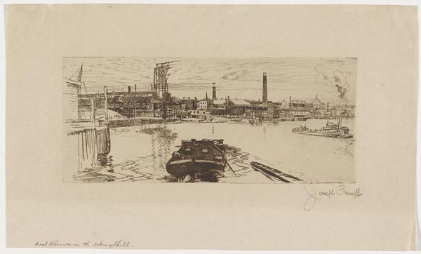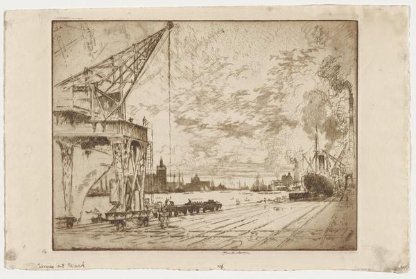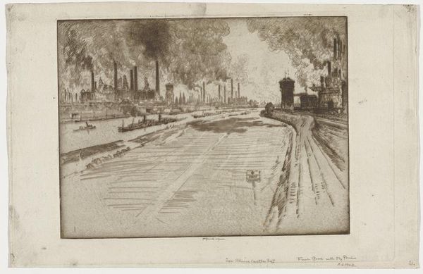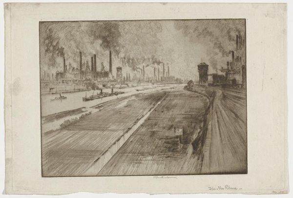 Joseph Pennell made this etching, The Colliery Ruhrort Near Oberhausen, at an unknown date. What strikes me is the immediacy of the marks, the almost scribbled lines that describe this industrial landscape. You can almost feel Pennell wrestling with the plate, trying to capture the grit and the grime of the place. The texture is really what grabs me. Look at the way he’s used the etching needle to create these dense, layered lines. It's not just about depicting the scene; it's about conveying a feeling, a sense of the weight and density of the industrial structures. Notice the sky, how it seems to press down on the scene, rendered with these furious, chaotic strokes. Then there's the smokestack on the right. It’s not just a straight line; it's got this wobbly, almost organic quality, like it's breathing. It reminds me of Piranesi's etchings of Rome, but with a more modern, industrial sensibility. Both artists share this fascination with the epic scale of human construction. Ultimately, it’s about the push and pull between representation and abstraction, and the way that art is not about fixed meanings but a process of seeing and thinking.