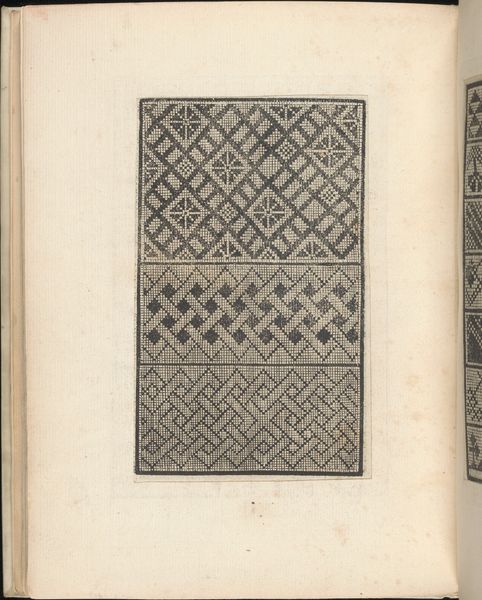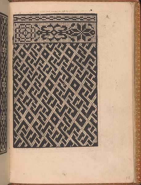 Curator: Here we have Matteo Pagano’s “Ornamento delle belle & virtuose donne, page 17 (verso)” from 1554, a drawing and print now held at the Metropolitan Museum of Art. It’s an engraving showing a geometric pattern. Editor: My immediate impression is of something almost pixelated, yet incredibly intricate. The contrasting blacks and whites create a dizzying, tessellated effect. Curator: Precisely. Pagano wasn’t aiming for pure aesthetics. This print served a very practical purpose: a pattern for lacemakers and embroiderers. Its materiality—the paper, the ink, the very act of reproduction—democratized access to design. Editor: But look at how carefully the lines are constructed. The formal interplay of shapes –squares and twisting knot forms – creates a harmonious balance, guiding the eye through its complexities. We have these dense, dark areas offset by the delicate lattice of lighter squares. Curator: Right. The print’s very existence is bound to the burgeoning textile industry of 16th-century Italy. Consider the labor: the engraver, the printer, the women using these patterns. The consumption it fueled is also part of this history. Editor: It's fascinating how Pagano uses this grid to create the illusion of depth and movement within a purely two-dimensional medium. Curator: And the intended consumer? A “virtuous woman,” skilled in domestic arts. But consider, too, the agency she gained through creating something beautiful and functional. It's more than just decorative; it’s about participation in a larger economic network. Editor: I hadn't considered the socioeconomic context so deeply before. Thanks to your perspective, I now understand it as a confluence of design and craft with women’s labor and agency. Curator: And for me, I’m again reminded how such carefully crafted objects such as this also invite one into a contemplative and rewarding act of close visual reading.