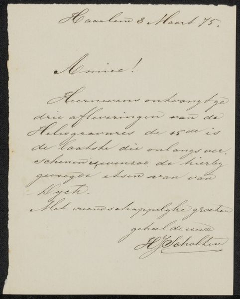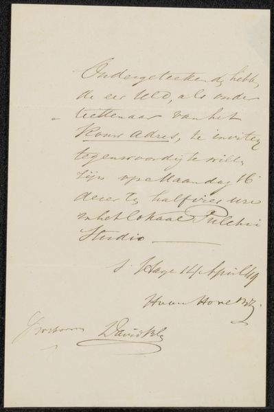 This is Charles Rochussen’s ‘Brief aan de Commissie van de Tentoonstelling van Levende Meesters in Haarlem,’ created in 1843. Executed in ink on paper, it embodies an era of formal correspondence, yet its artistic merit lies in the visual structure of the handwriting itself. The script cascades down the page, a series of elegant, looping forms creating dynamic lines of communication. Each word, a semiotic sign, is meticulously shaped, carrying both linguistic meaning and visual weight. The varying pressure of the pen creates a play of light and shadow, lending depth and texture to the surface. The composition is asymmetrical, with the artist's signature and date anchoring the lower portion. This piece transcends its literal content. It becomes an exploration of form, line, and the very act of writing as a mode of artistic expression. Rochussen transforms a simple letter into a study of visual aesthetics. It prompts us to consider how art challenges conventional forms of communication. It functions as a discourse on the intersection of language, art, and cultural expression.