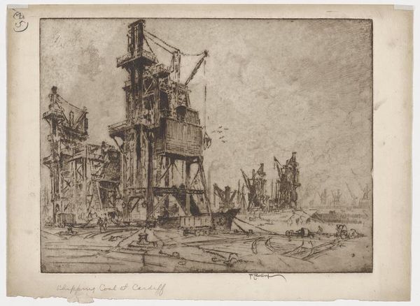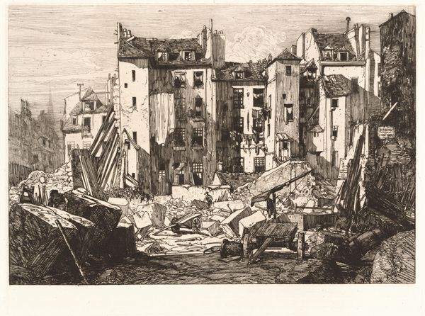 Maxime Lalanne made this etching, ‘Demolition for Tunnelling in the Boulevard Saint-Germain,’ using black ink on paper. The composition divides into a foreground of rubble and a background of skeletal buildings against a sky punctured by a distant dome and smokestack. The scene’s impact derives from the artist’s linear precision and the stark contrast between light and shadow. This print documents the urban transformations reshaping Paris during the Second Empire. Lalanne focuses on the raw materiality of the construction site, using dense, cross-hatched lines to convey the roughness of the stones and the instability of the half-demolished structures. The artist’s engagement with materiality extends beyond mere representation. The print challenges viewers to reconsider their relationship to the urban environment by exposing the chaotic processes beneath the city’s facade. The print functions as a symbol of progress and the cultural cost of modernization.