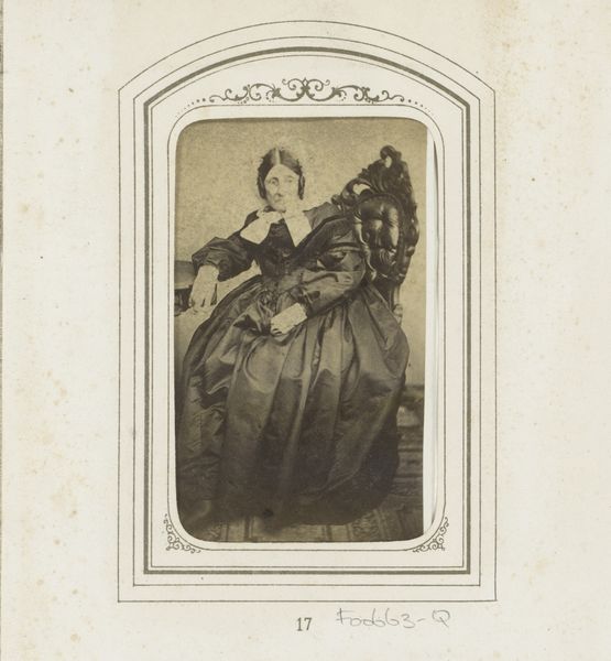 This is an undated portrait of a seated old woman made by Hermanus Siderius. The photograph is a study in contrasts, primarily grayscale, and is rigidly composed. The woman's imposing figure, framed by the ornate chair, commands attention. Siderius uses the meticulous detail of her dress and the chair's embellishments to investigate the textures of the material. This creates a visual dialogue between the sitter and her environment. We see the meticulous arrangement of space and form which reflects 19th-century conventions of portraiture. Notice how the play of light and shadow sculpts her face, lending her a weighty presence. Siderius here is using both light and shadow to subtly challenge the surface-level understanding of portraiture to invite reflections on the sitter's internal life and cultural context. The portrait becomes not just a representation but an active participant in a visual discourse.