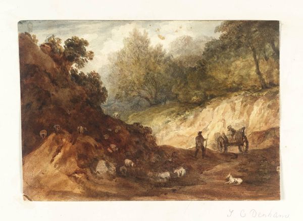 Curator: Let's take a look at this intriguing piece attributed to Thomas Gainsborough, created sometime between 1760 and 1765, called "Country Lane with Gypsies Resting". What's your first impression? Editor: A muted dream, really. It's got that wistful quality, a softness… the gypsies are nestled at the bottom left in almost faded ink, but everything else around it feels like a hushed watercolor symphony. What do you see? Curator: I'm drawn to how Gainsborough, even in what appears to be a genre scene, emphasizes the landscape's role. It's not just a backdrop, but almost the main subject. The gypsies are workers who are presented with an elegant Rococo finish but still closely tethered to the dirt path itself. You can see how nature shapes lives here; this lane probably has an active social hierarchy related to the traffic flow, material extraction, and property values along it. Editor: I like how you look at it! I’m picking up on the social commentary, yes. The trees are all kind of gnarled and bending, but stately—protecting the vulnerable family taking shelter. Almost like an allegorical wink, do you think? Gainsborough was poking fun at the romanticization of the wealthy here while nodding to the poor who really sustain that class. Curator: Yes, certainly the watercolor as a medium lends itself well to that airiness, blurring the harsh edges of the social commentary. Notice also how Gainsborough employs rapid, light brushstrokes, indicating a less formalized artistic process, one maybe done partially on location, embracing the raw qualities of watercolor rather than trying to tame it into imitating oil. What a commentary about labor power, really! Editor: Agreed! It’s the sketchiness I really dig; a peek into a quick moment that would otherwise be totally overlooked. Makes me think of our own disposable culture and fast consumption! It seems Gainsborough invites the viewer to reconsider what’s beautiful. Curator: Definitely, it's a reminder that even what appears unfinished or fleeting can carry immense value and depth. Editor: Well put. It gives "low brow" material subjects a really "high art" aesthetic that allows us to explore and examine the everyday struggle to thrive and prosper! Curator: Absolutely, seeing the connections is the beautiful part.