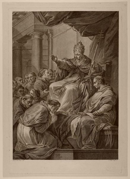 Curator: This is "Elymas, the Sorcerer, Struck with Blindness" by Thomas Holloway. Editor: Wow, a dramatic moment frozen in time! All those figures, the architecture... it feels like a stage play. Curator: It depicts a scene from the Acts of the Apostles. Elymas, a magician, is struck blind by the apostle Paul for opposing the spread of Christianity. Holloway, who lived from 1748 to 1827, has chosen a powerful narrative. Editor: There's something theatrical about the composition, the way all eyes are directed to Elymas flailing blindly. You almost feel the energy crackling in the air. Curator: I agree. Holloway's piece offers a glimpse into the politics of religious conversion, and how it was depicted in art of the era. It makes you wonder about the power dynamics at play. Editor: Yes, what does it mean for a sorcerer to lose sight? Perhaps losing one's vision opens one to something greater. Curator: An intriguing thought. It gives us much to ponder, doesn't it? Editor: Absolutely, art becomes a dialogue across centuries.